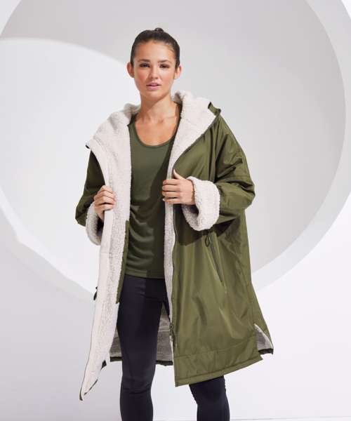 TriDri’s latest outerwear is essential in everyone’s wardrobe! The TriDri® All-seasons waterproof changing robe boasts a waterproof exterior with hood to keep you dry, as well as adjustable straps to the wrists and chin guard to help lock in heat on windy days. The cosy sherpa fleece interior absorbs moisture and keeps you warm, making it a great choice after water activities or rainy days on the football pitch. Designed to be oversized, the jacket is ideal for changing into warm, dry clothes, offering a double zip – so more room to move! Featuring multiple deep pockets, inside and out, it’s not just for athletes, but perfect for rainy commutes or frosty walks with the dog.